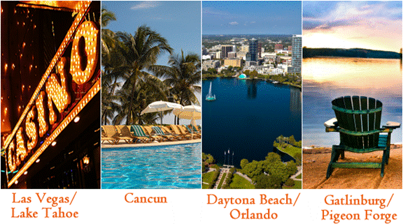 Choose from the following destinations: Anaheim, CA, Antioch, CA, Atlanta, GA, Atlantic City, NJ, Augusta, GA, Branson, MO, Brunswick, GA, Cancun, MX, Charleston, SC, Chicago/O'Hare Area, IL, Coeur d' Alene, ID, Columbia, SC, Dayton, OH, Daytona Beach, FL, Destin, FL, Florence, SC, Ft. Lauderdale, FL, Ft. Myers, FL, Gatlinburg, TN, Hilton Head, SC, Hollywood, CA, Honolulu, HI, Kissimmee, FL, Lake Tahoe, CA, Las Vegas, NV, Myrtle Beach, SC, Nashville, TN, New York, NY, Niagara Falls/Buffalo Area, NY, Niagara Falls, ON/CAN, Orlando, FL, Ormond Beach, FL, Palm Springs, CA, Pigeon Forge, TN, Portland, OR, Saint. Petersburg, FL, Salt Lake City, UT, San Antonio, TX, San Diego, CA, San Francisco, CA, San Mateo, CA, Seattle, WA, Sedona, AZ, Sonoma Wine Country, CA, St. George, UT, Tallahassee, FL, Tampa, FL, Tucson, AZ, Washington, D.C., Williamsburg, VA, Wisconsin Dells, WI